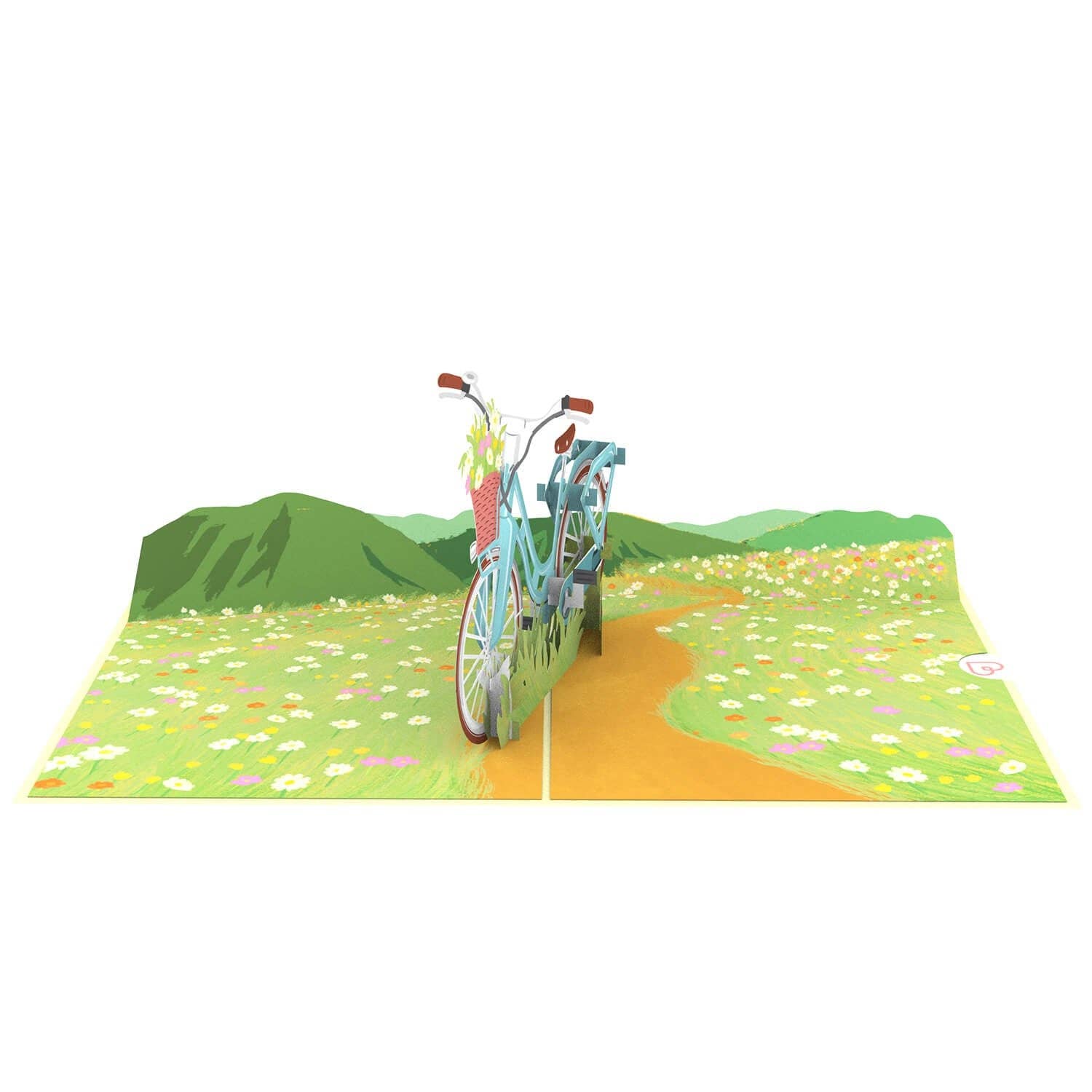When you open the card, a light blue women's bike unfolds. The bike is parked on a small path that meanders along a beautiful flower meadow. The bicycle basket is also decorated with a few freshly picked flowers. The outflows of green mountains can be seen on the horizon.