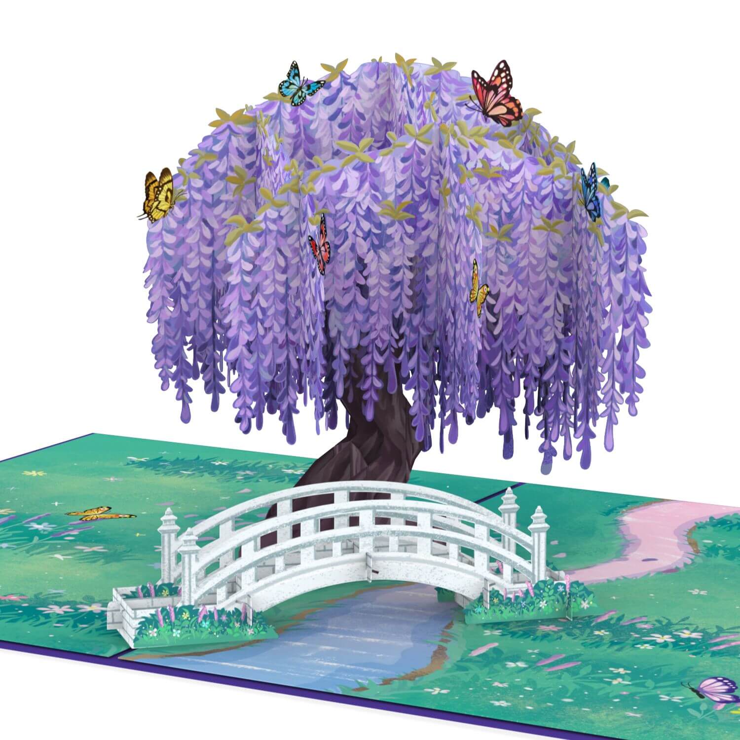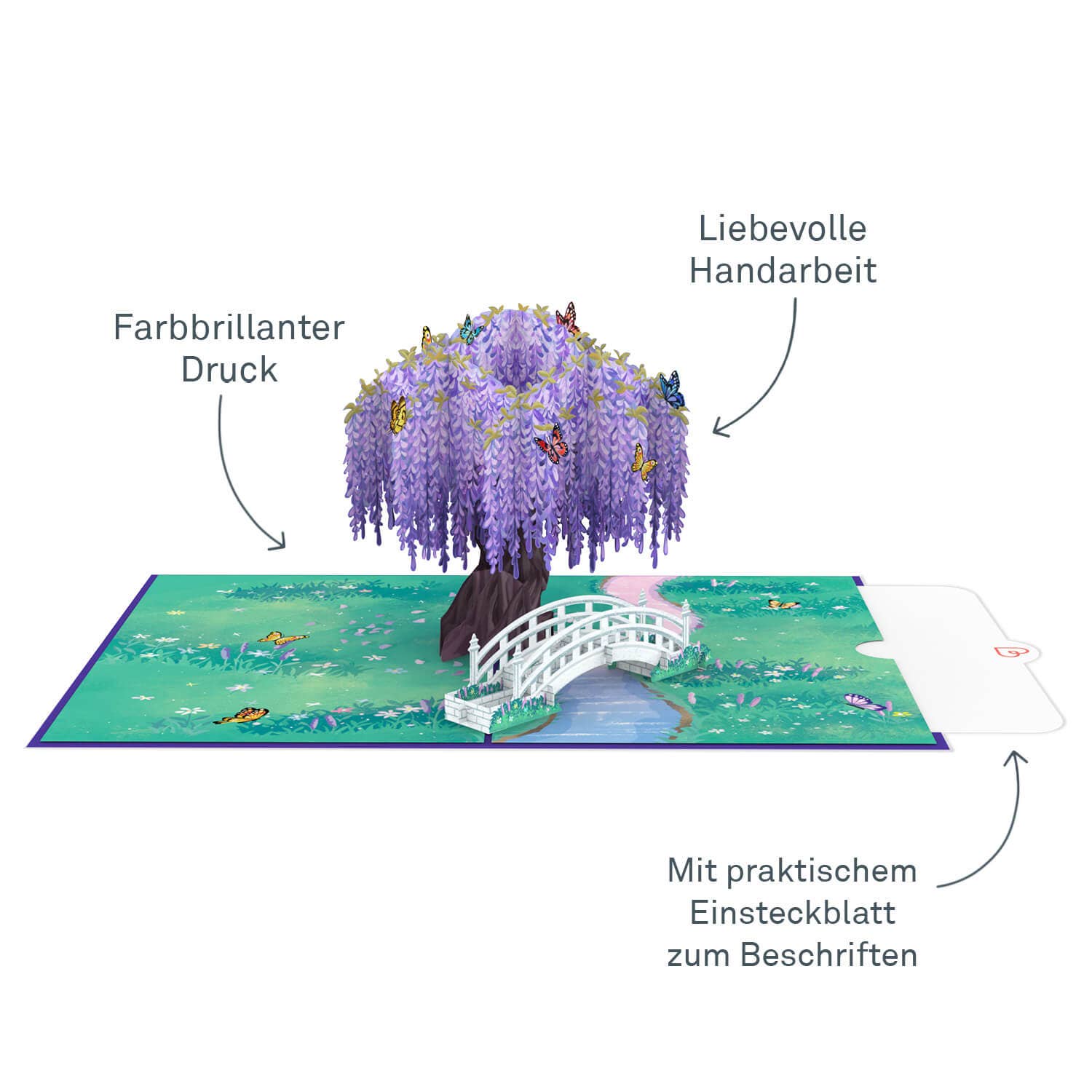 Let yourself be enchanted by our magical 3D pop-up card with a beautiful blue rain tree with butterflies. When you open the card, the filigree tree with colorful, playful butterflies unfolds on a green flower meadow. A small white wooden bridge, which leads over a rippling stream, completes the picturesque picture. The purple cover of the 3D card also shows blue rain blossoms and colorful butterflies.
