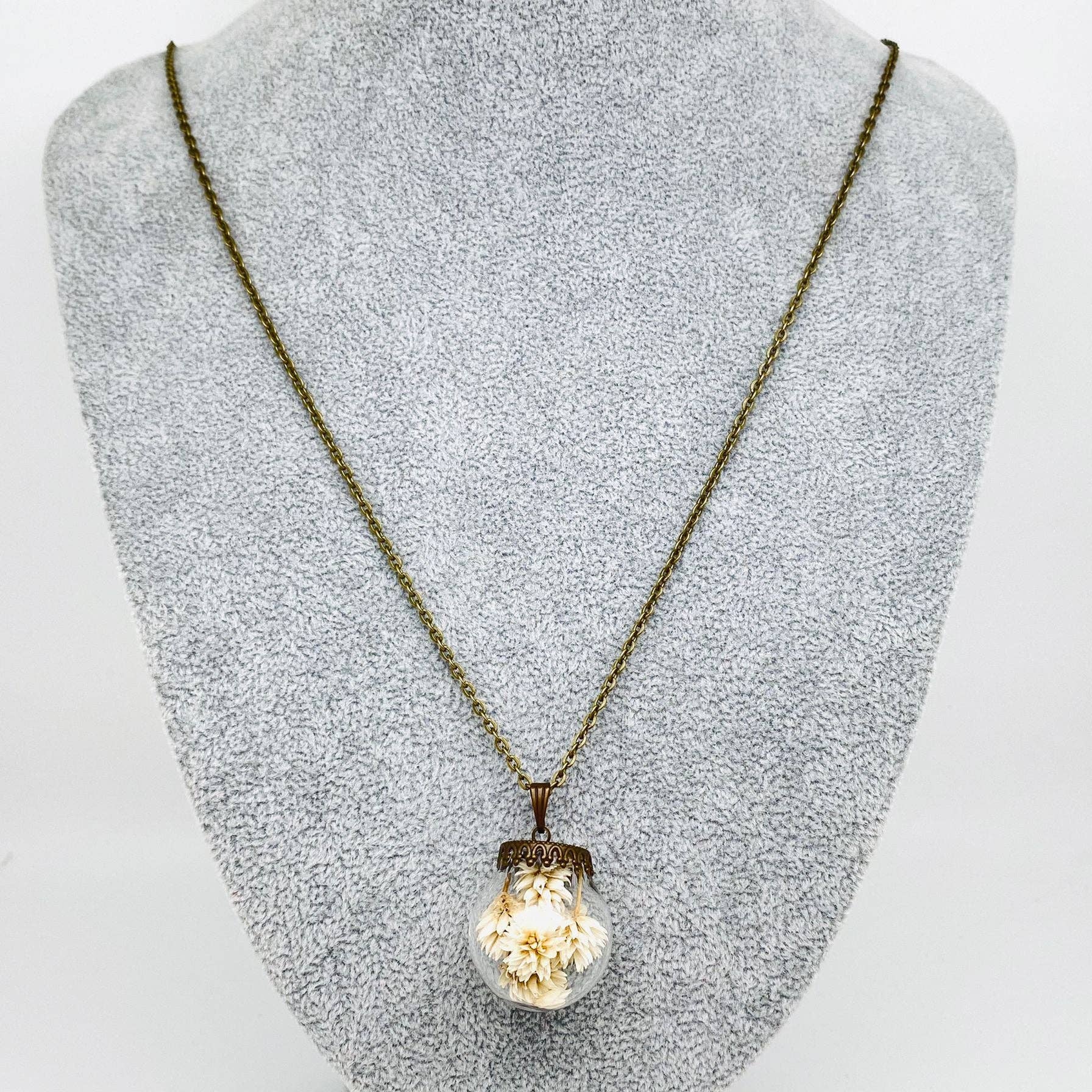 Genuine dried flowers are delicately encased in a clear glass ball-shaped pendant, creating a captivating and elegant accessory.