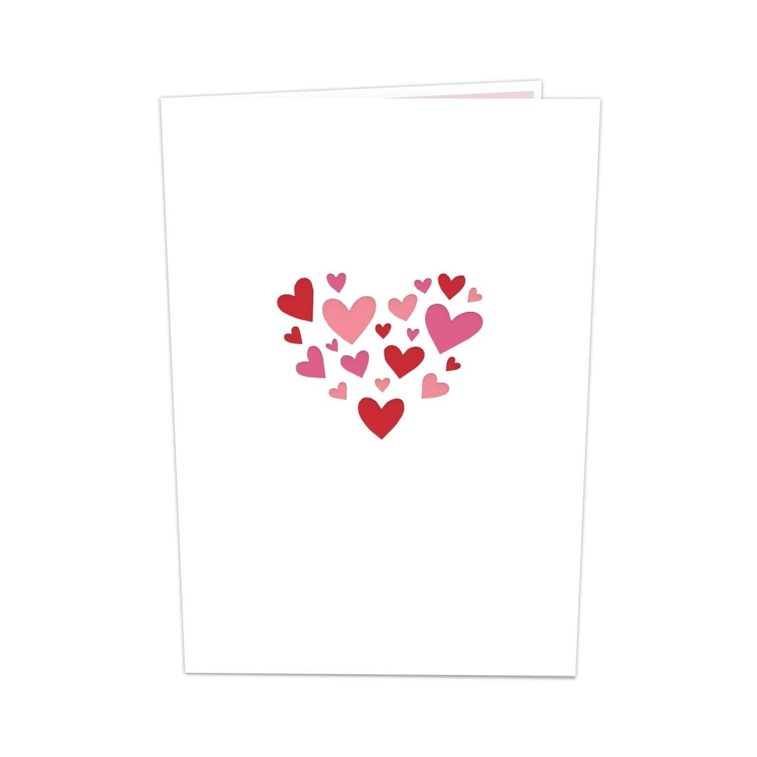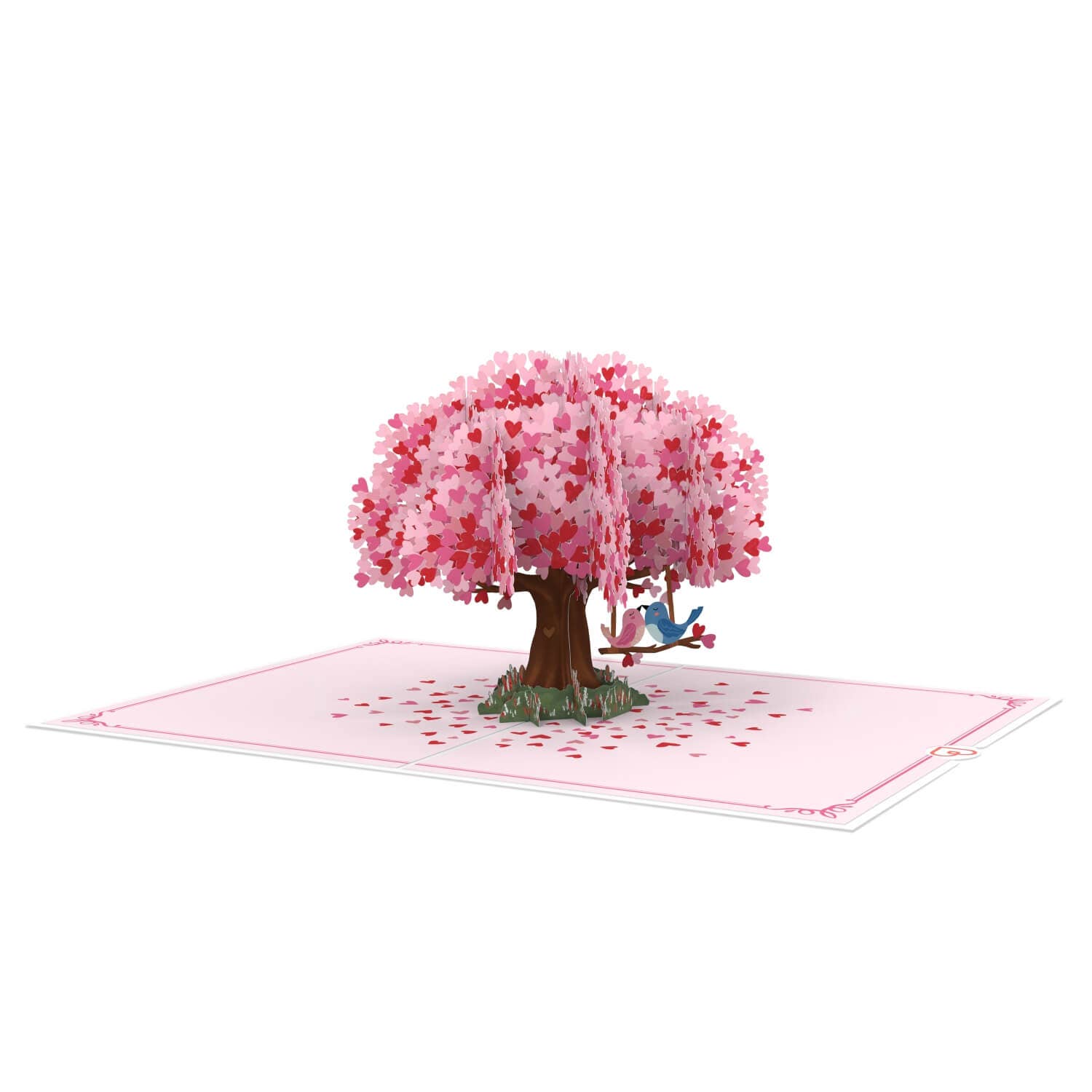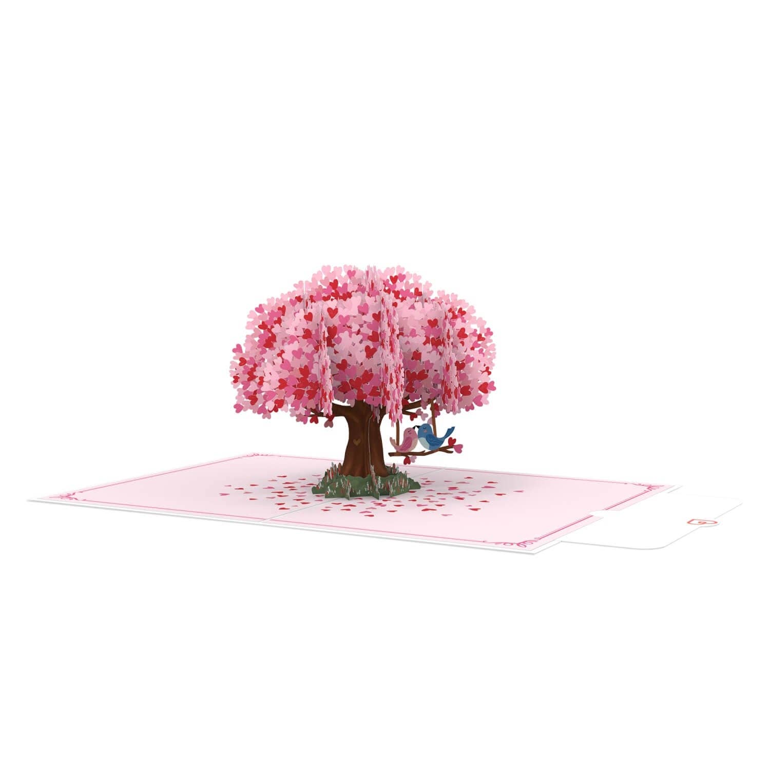 Discover this charming pop-up card with a heart tree and enchant your partner with a lovely message. When you open the 3D card, a beautiful heart-shaped tree unfolds with pink, pink and red petals. A wooden swing hangs in the tree, on which two cute turtledoves sit and lovingly beak each other.