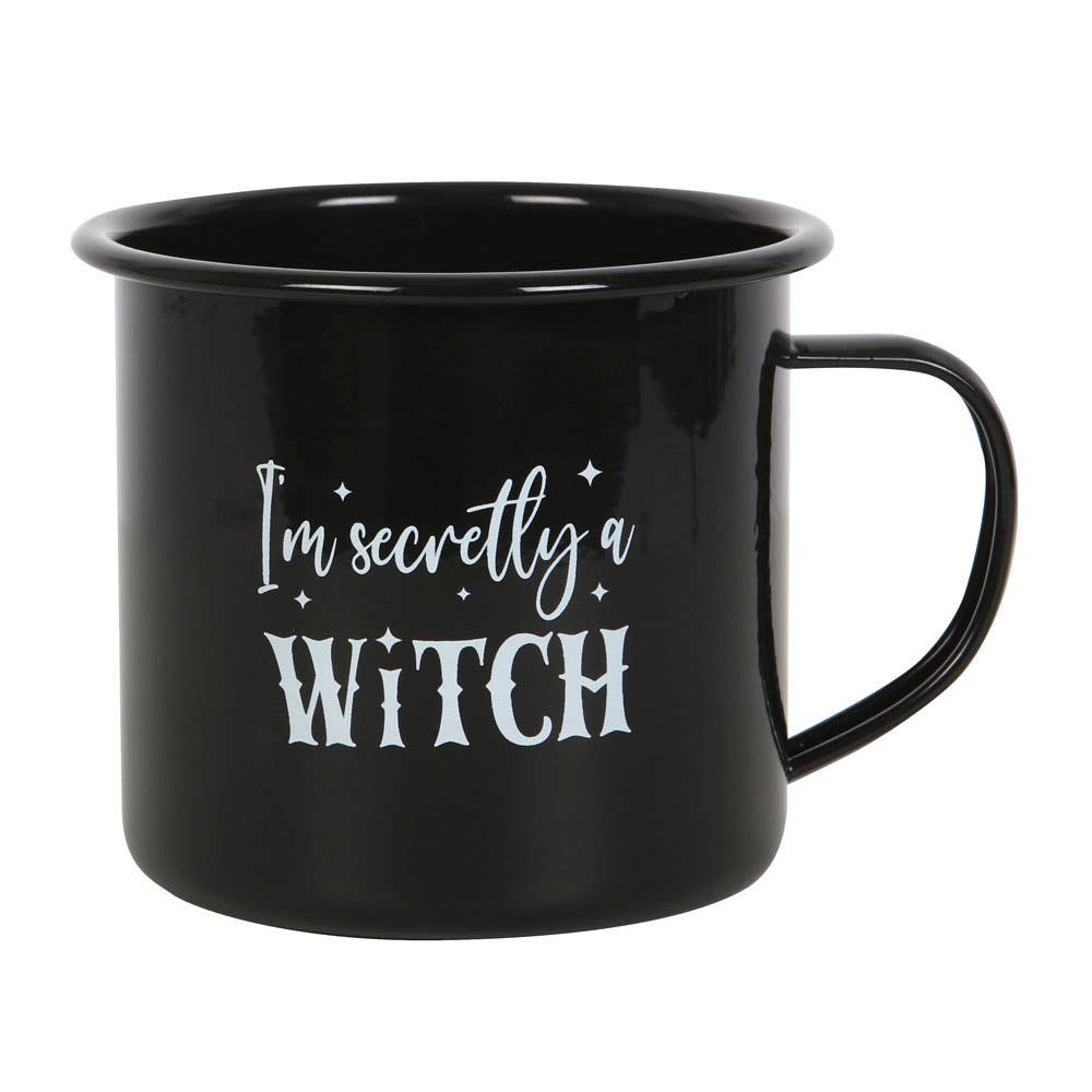Even witches need to keep hydrated! This enamel-style mug features fun 'I'm secretly a witch' text on a black base that's great for spooky brews. Do not microwave or use over open flame. Hand wash only. Designed by Something Different Wholesale and part of the Wicked Witch range of Halloween gifts and home decor.