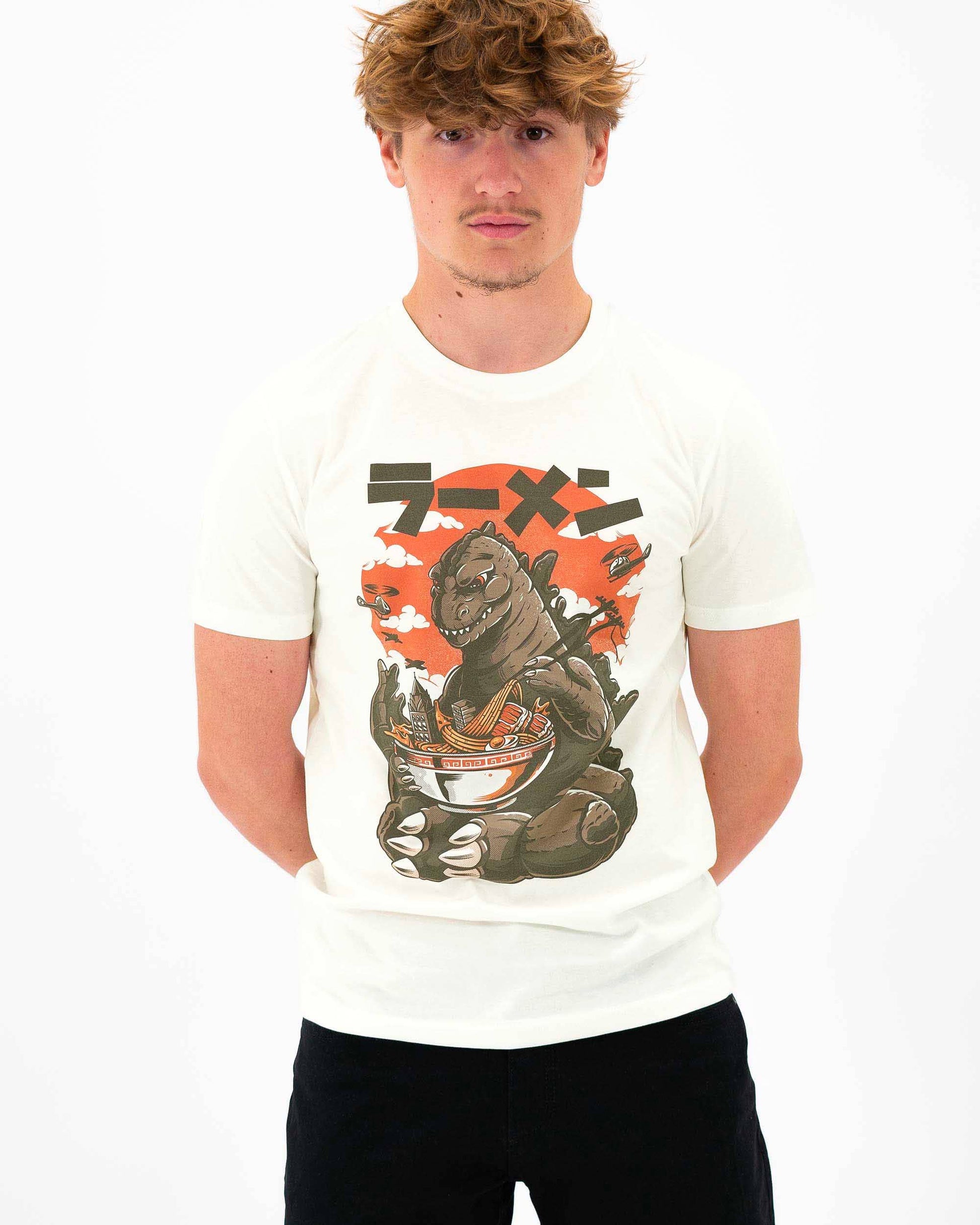 Kaiju's Ramen T-shirt where a Godzilla enjoys a bowl of ramen after his attack on the city. Quiet!