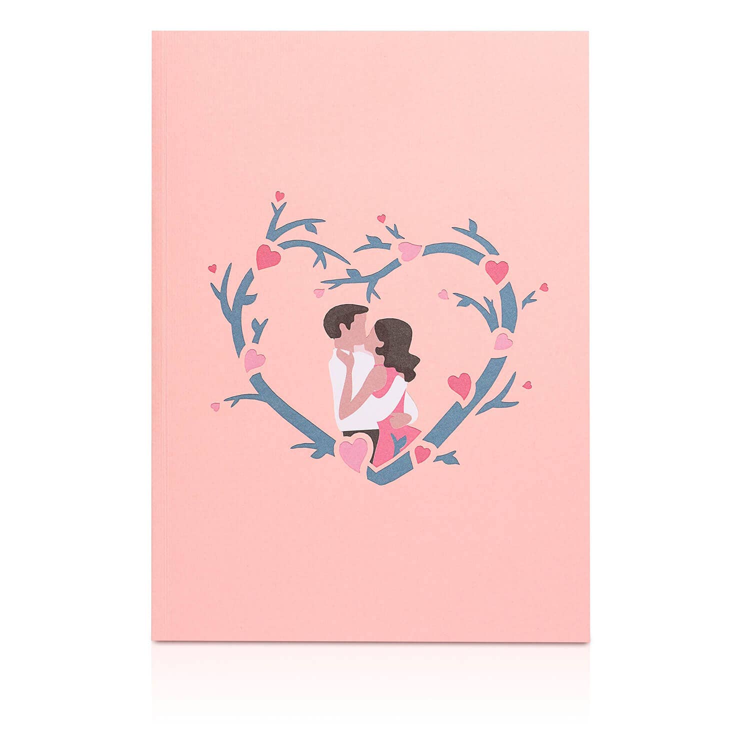 How romantic! When you open this sweet 3D folding card, a wonderful love scene unfolds. A couple in love stands close together under a tree with heart leaves. The romantic scene is surrounded by a bicycle under a lantern and a bench. Illuminated houses can be seen in the background. The greeting card is decorated in soft shades of pink and purple — making the card particularly romantic!