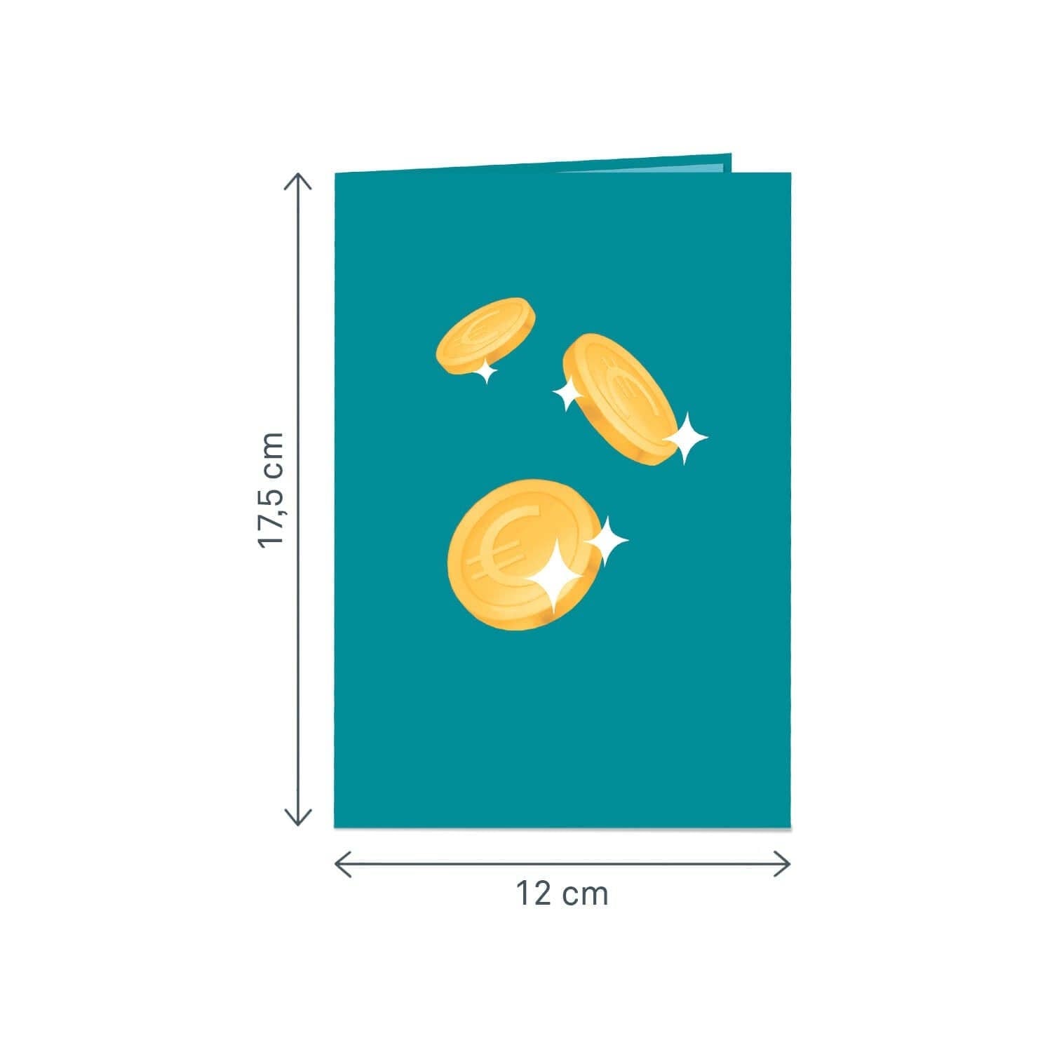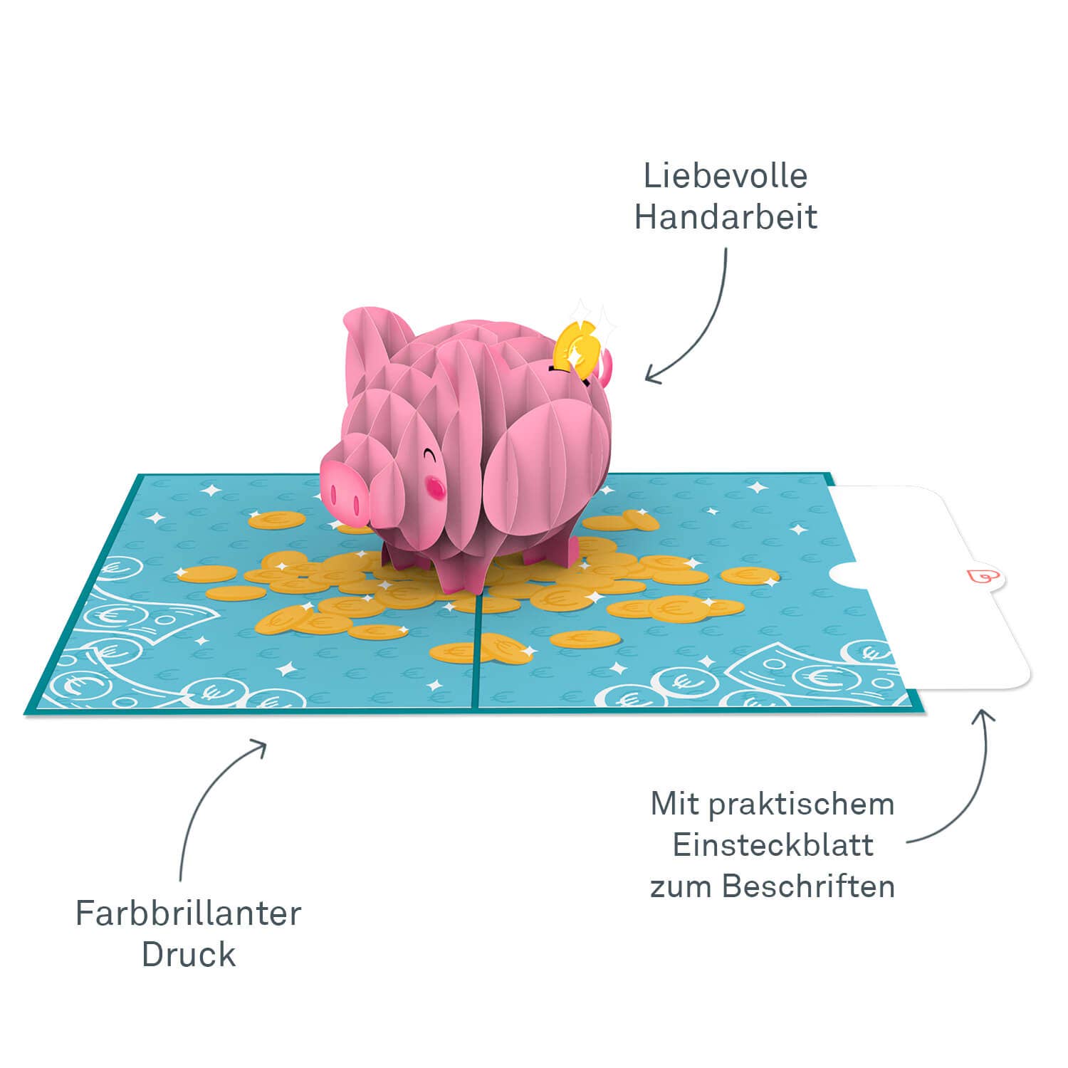 Are you looking for a unique way to give away money or vouchers? With our pop-up card with the adorable pink piggy bank, you're not only giving away money, but also a smile! In addition to a charming surprise, the piggy bank card also offers a practical solution: an integrated bank slot in the piggy for bank notes! When you open the card, the cheerful piggy bank greets you, surrounded by shimmering golden coins — a fun way to present congratulations and financial gifts.