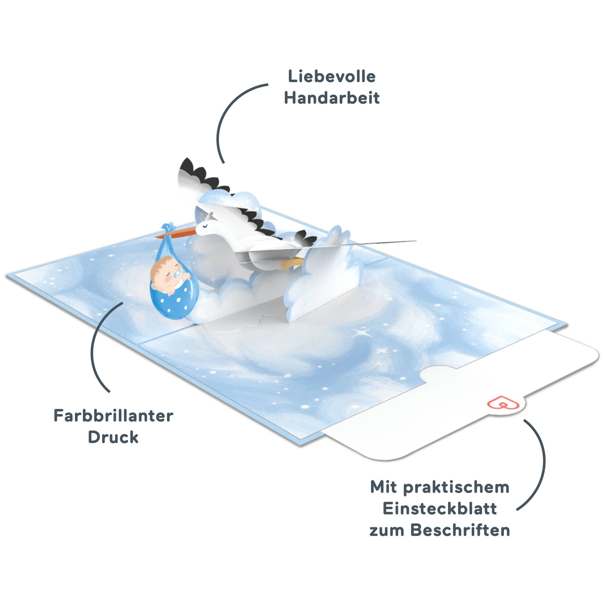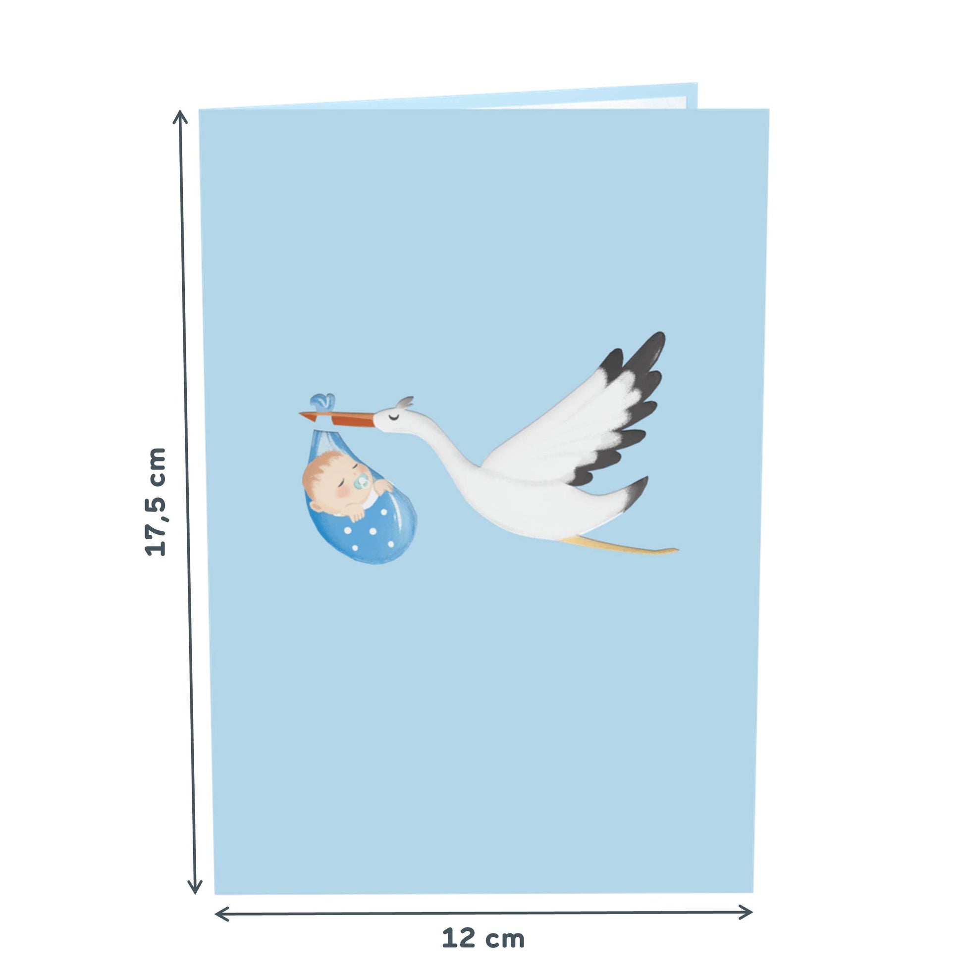Hello baby! Hooray, that's the baby! Happy birth! Welcome to Earth! No matter what you wish for new parents and their offspring — with our baby stork card, it will never be forgotten. When you open the card, the filigree stork with a blue baby bundle unfolds in its beak. He flies through the clouds and brings the newborn baby to his parents — at least that's the legend.
