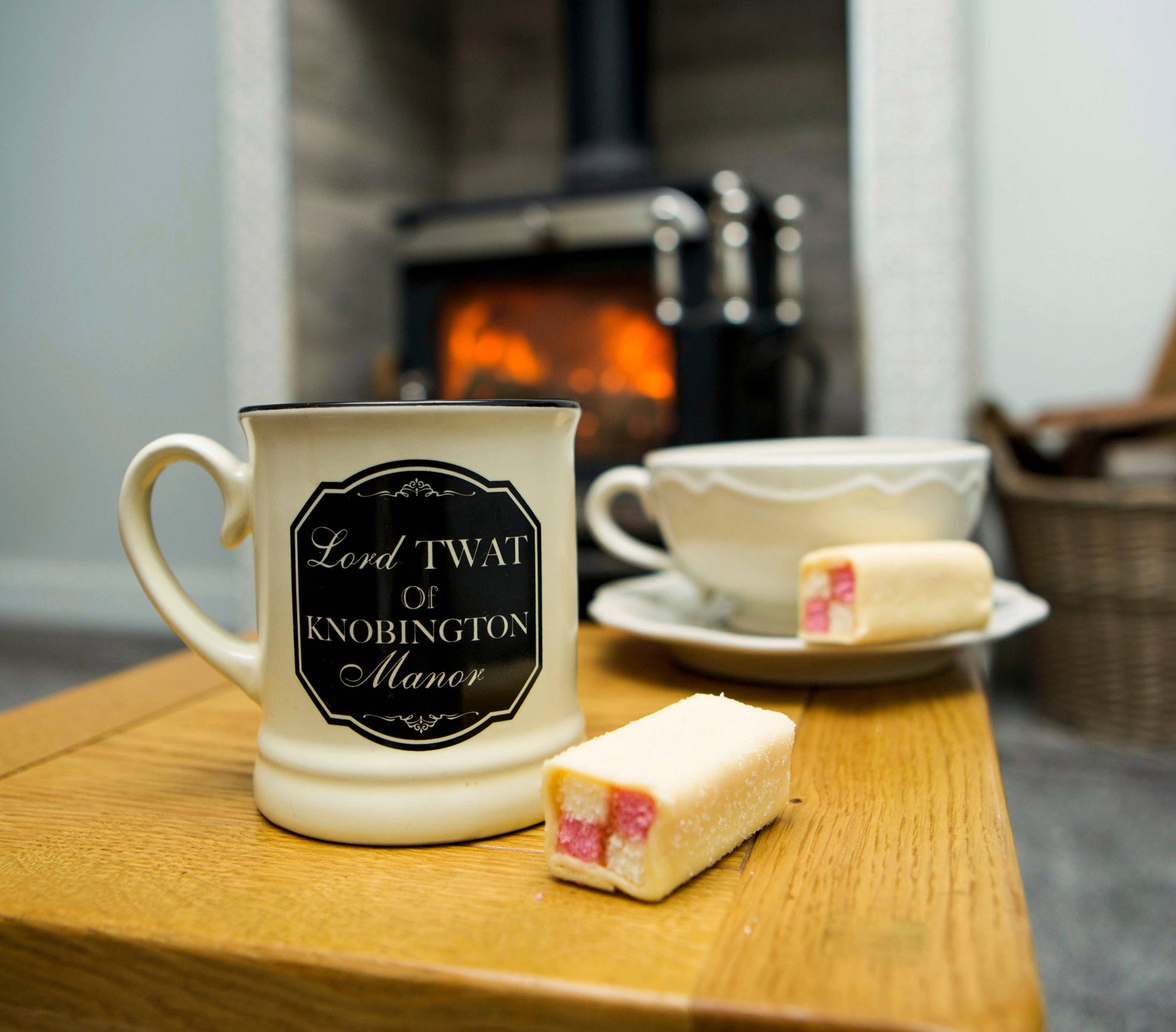 Declare your title as lord twat of knobbington manor with this brilliantly worded cream victoriana mug with black detail. Elegantly designed with a not so elegant sentiment, this mug is sure to put a smile on anyone's face. Complete with a stylish gift box, this mug is perfect for a hilarious gift to yourself or someone else on their birthday, christmas or even valentines. If you know a deserving lady, why not treat them with our lady twat version of this exquisite mug.
