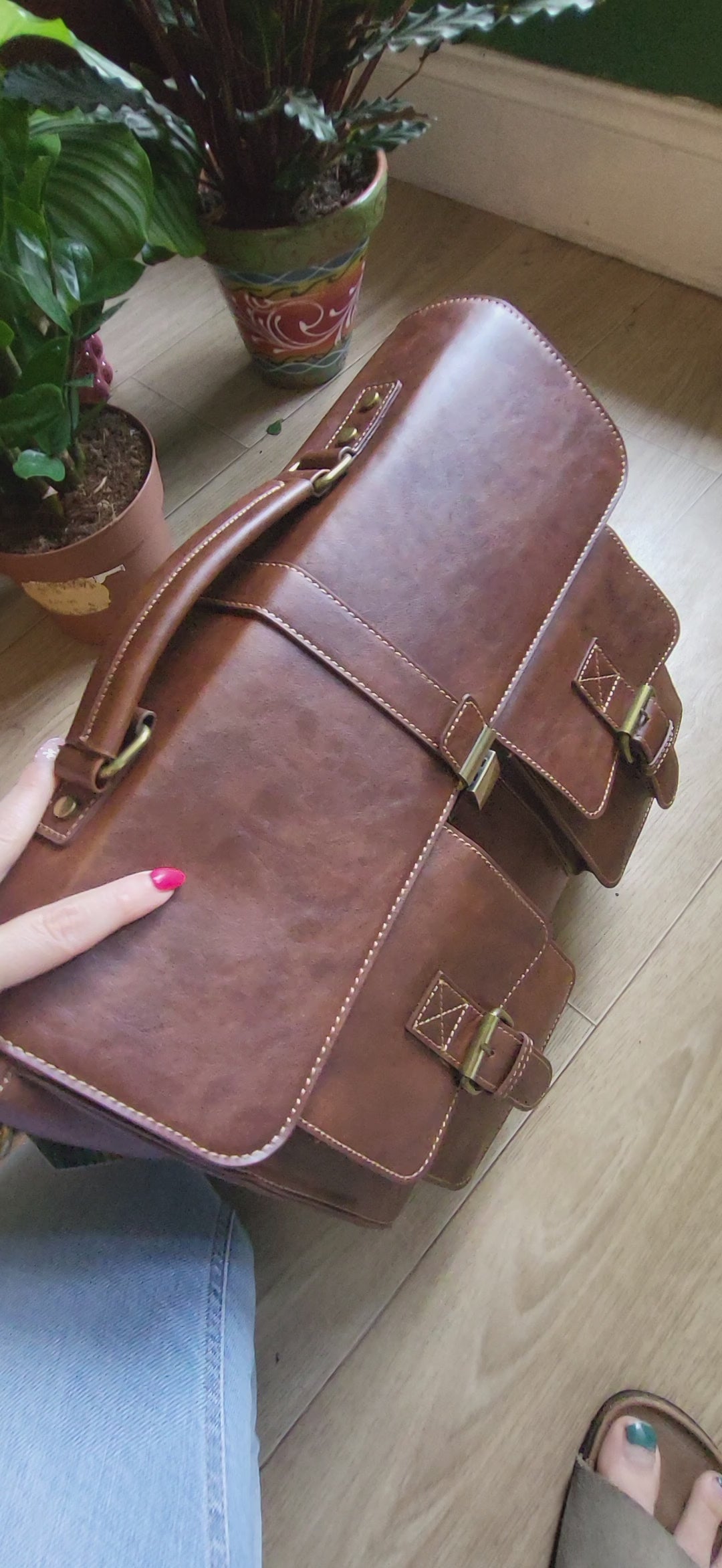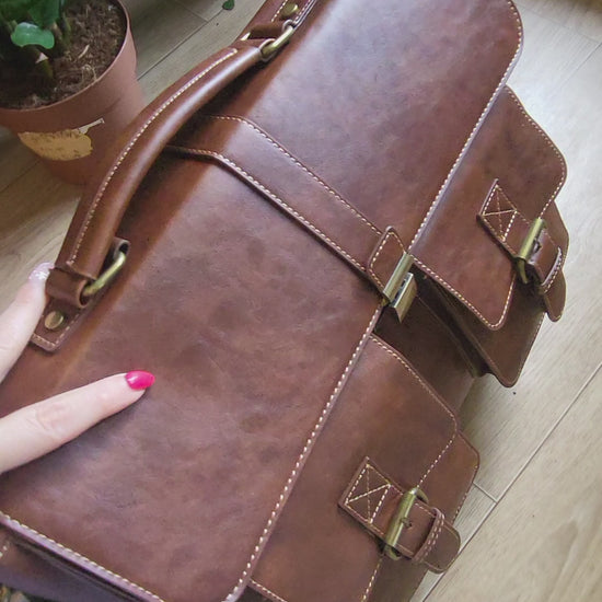 This vintage-style briefcase bag offers a chic and practical solution for carrying your essentials, featuring a dedicated laptop compartment and multiple pockets for organization. Its unique design is enhanced by both a small and large strap, providing versatile styling options and comfortable portability. Perfect for those seeking a blend of timeless elegance and functional convenience.
