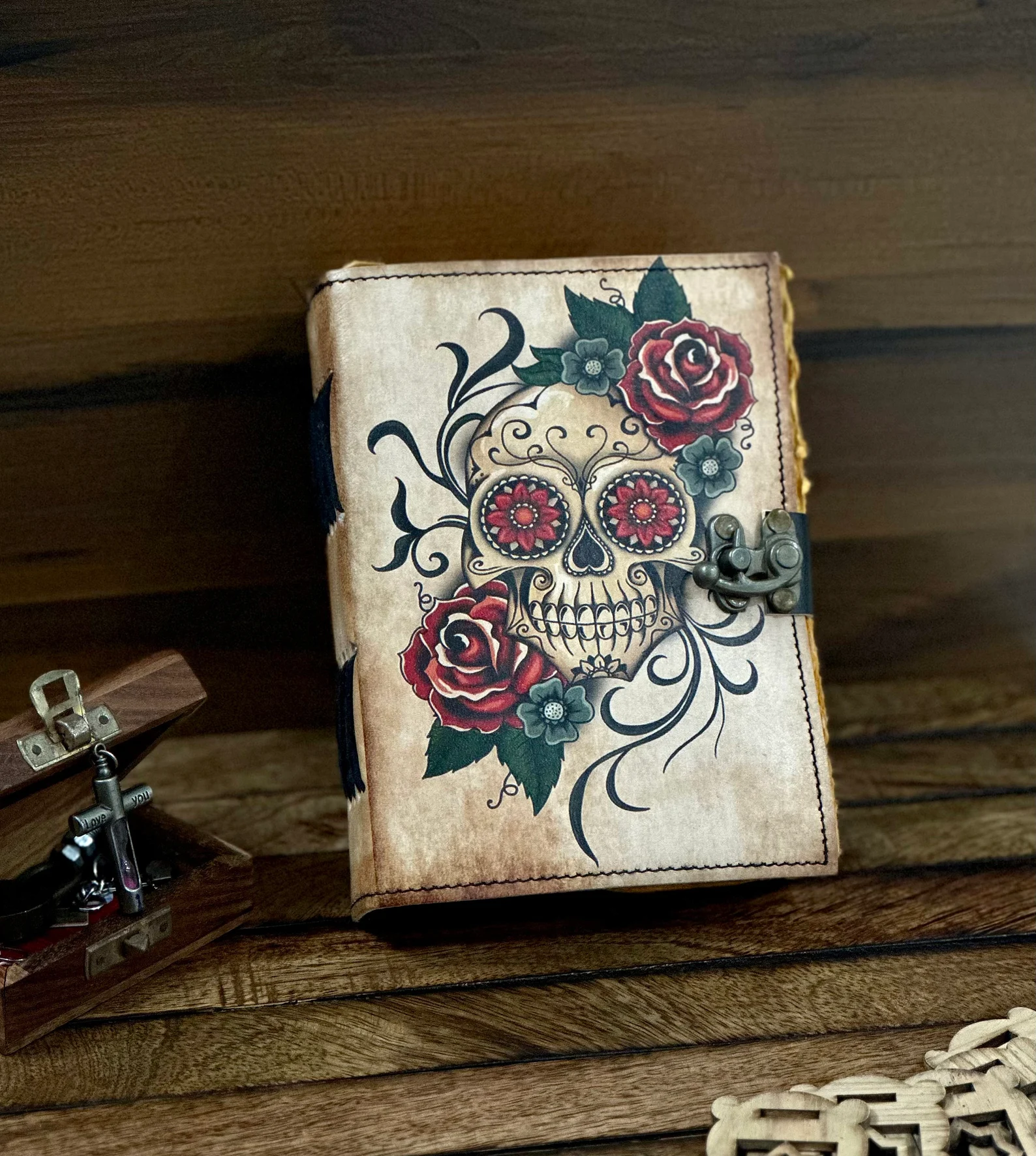 Vintage Leather Journal Grimoire with Sugar Skull Rose Print