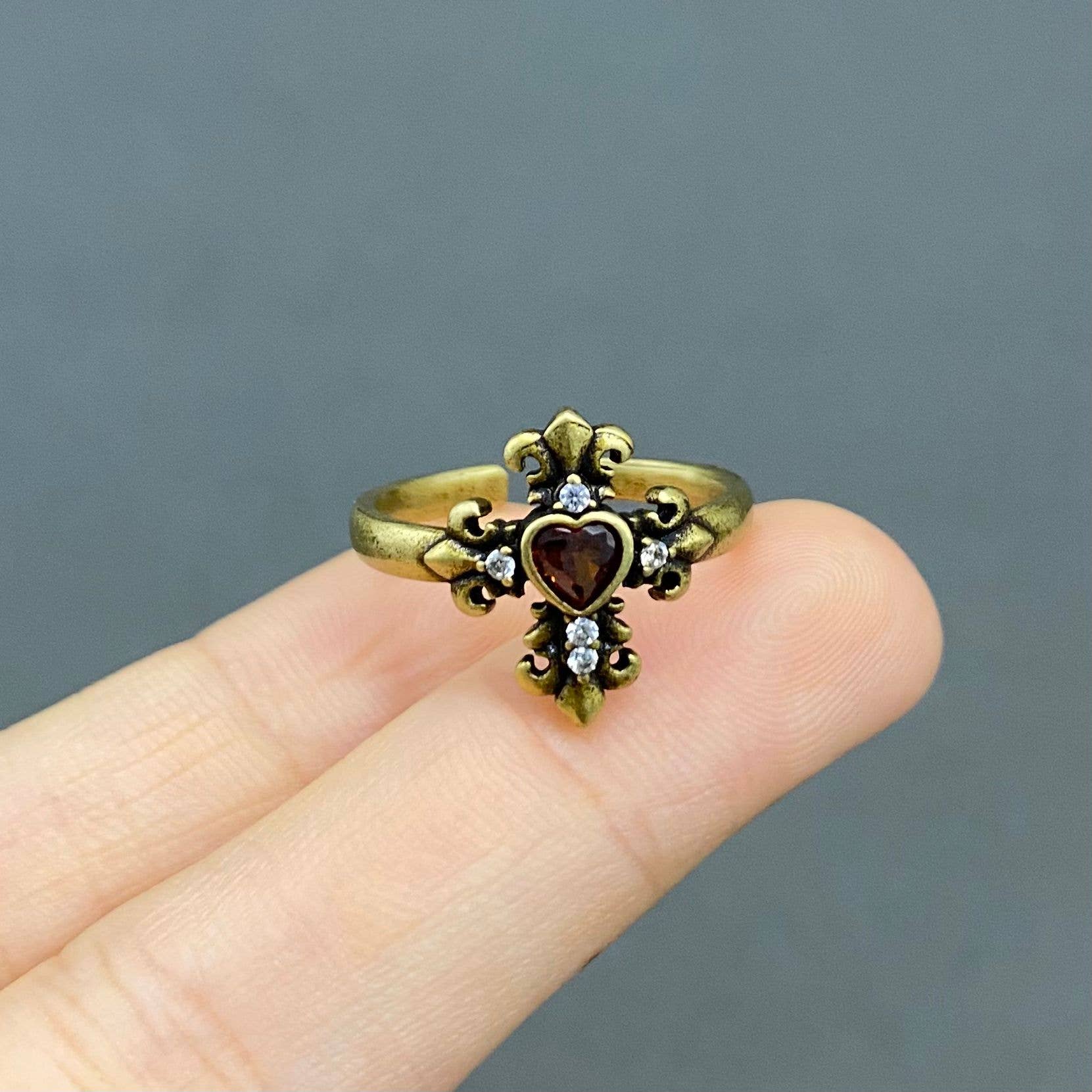 Vintage Red Rhinestone Heart Cross Bronze Adjustable Ring