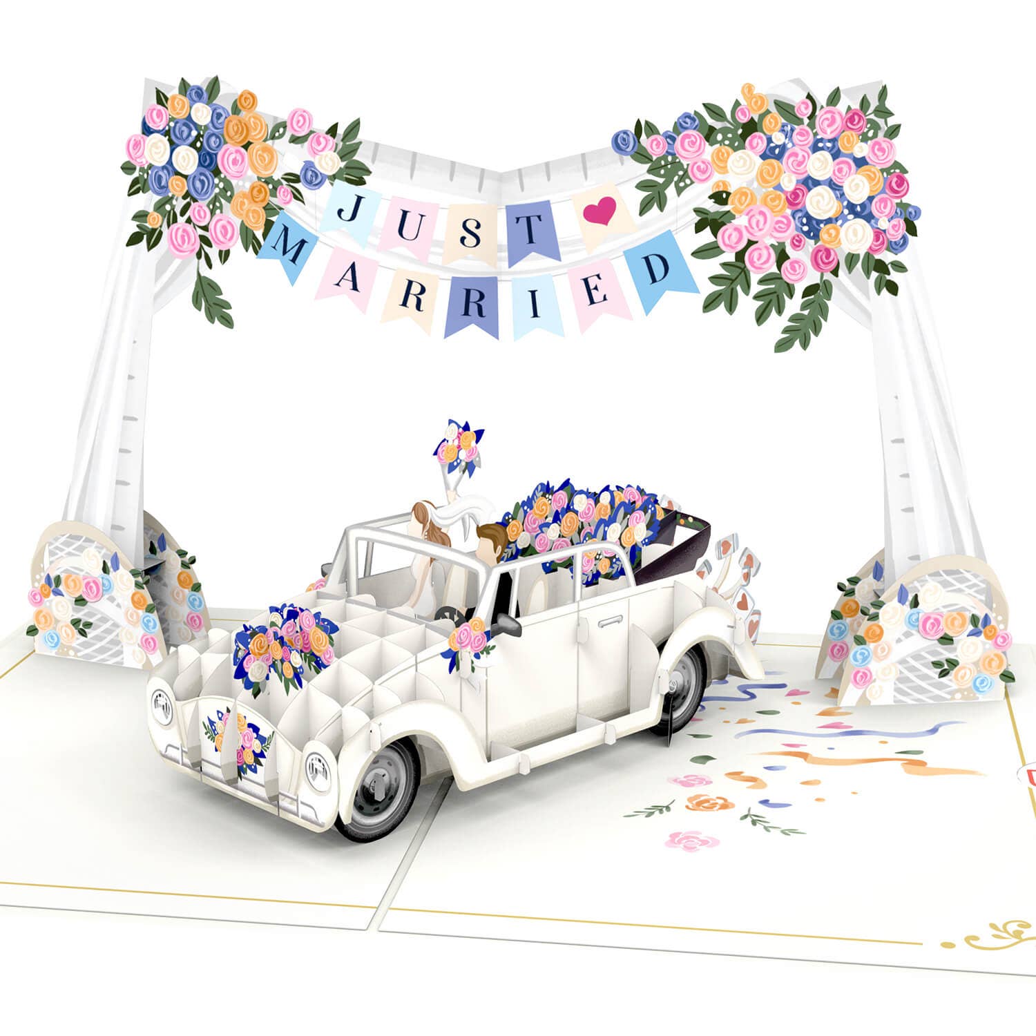 Wedding car with "Just Married" garland pop-up card