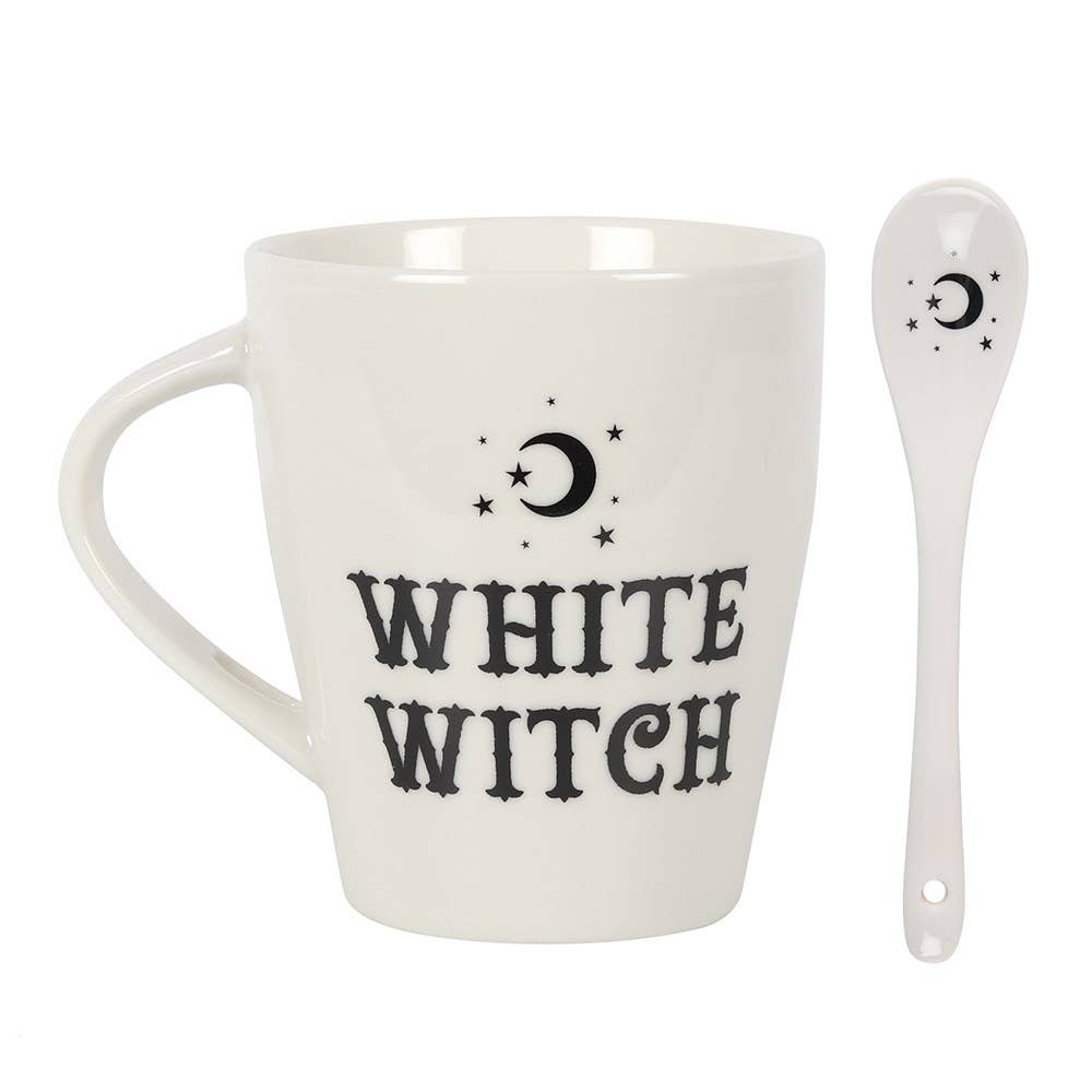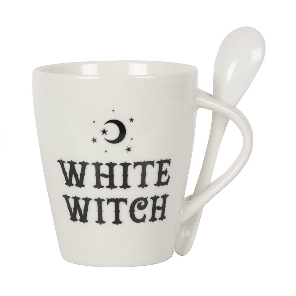 This bewitching mug and spoon set will add a pinch of magic to every cuppa. Style features 'white witch' text and matching teaspoon with a mystical moon and star design that fits perfectly in a slotted handle. 300ml capacity. The dishwasher and microwave are safe. Designed by Something Different and part of the bestselling black magic range of gothic gifts and homeware.